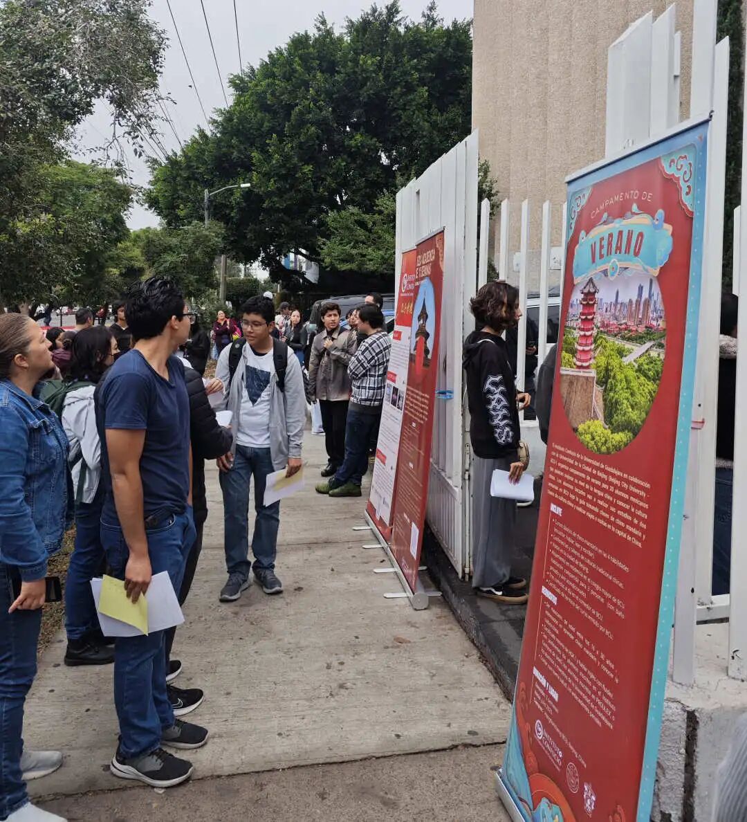 考场外,有关孔院日常工作的情况介绍,短期奖学金项目,夏令营项目的海报依次陈列,吸引前来送考的学生亲属及候场考生驻足观看。相关负责老师现场向学生及家长发放2026年夏令营预宣传资料,并就项目内容与报名相关的问题做了充分说明与答疑,确保信息传递规范、准确、到位。本次宣传受到考生和家长一致欢迎。