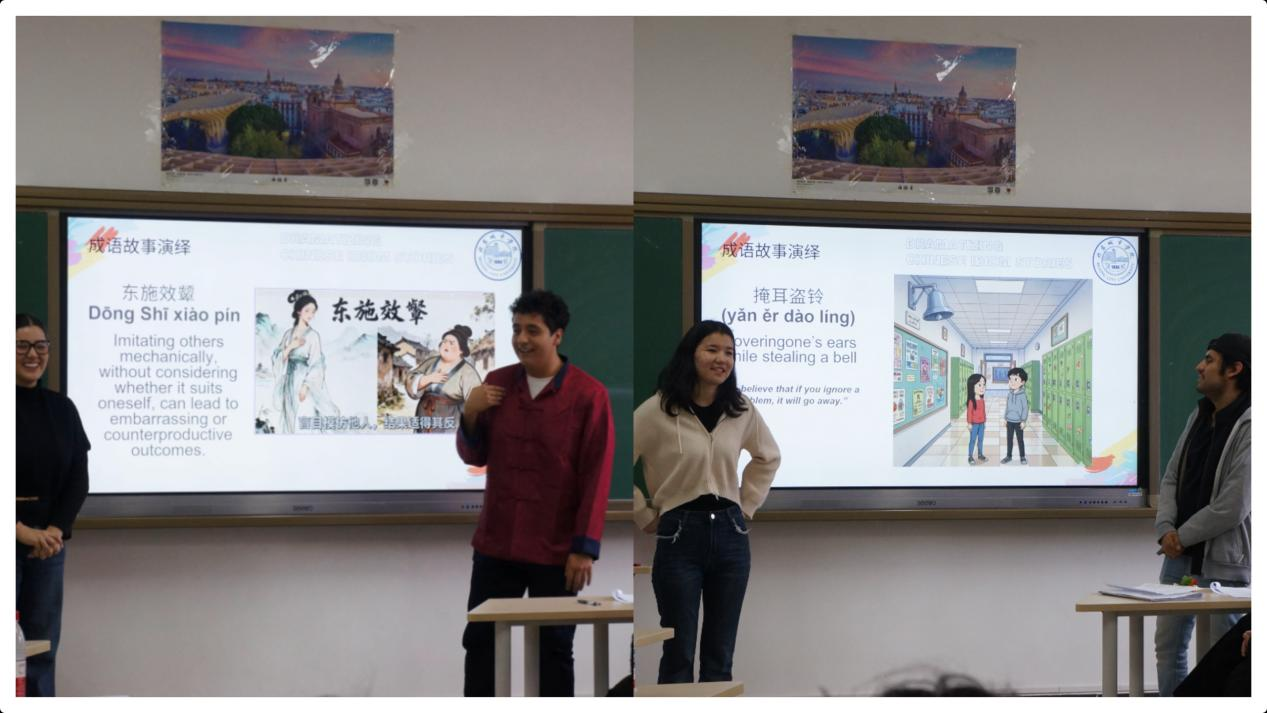 在文化成果展示环节,留学生们通过生动演绎《掩耳盗铃》《东施效颦》等成语故事,展现出对汉语语言精髓的理解和运用能力。在中国文化知识抢答环节,学员们积极踊跃参与,对答如流,充分体现了他们在课程学习中所积累的丰富文化知识。此外,留学生还带来了各具特色的才艺表演,现场气氛热烈而融洽。