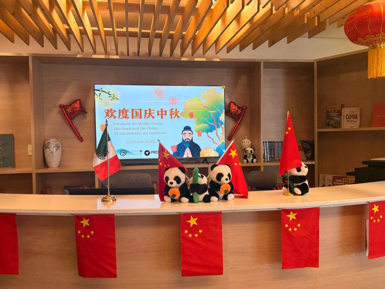 庆典在孔子学院举行,全体与会者齐唱中国国歌,气氛庄重。活动开场,中方院长程金贵致辞,强调孔子思想对中外文明的深远影响,介绍国庆和中秋的意义,指出孔子学院将继续促进中墨教育文化合作。